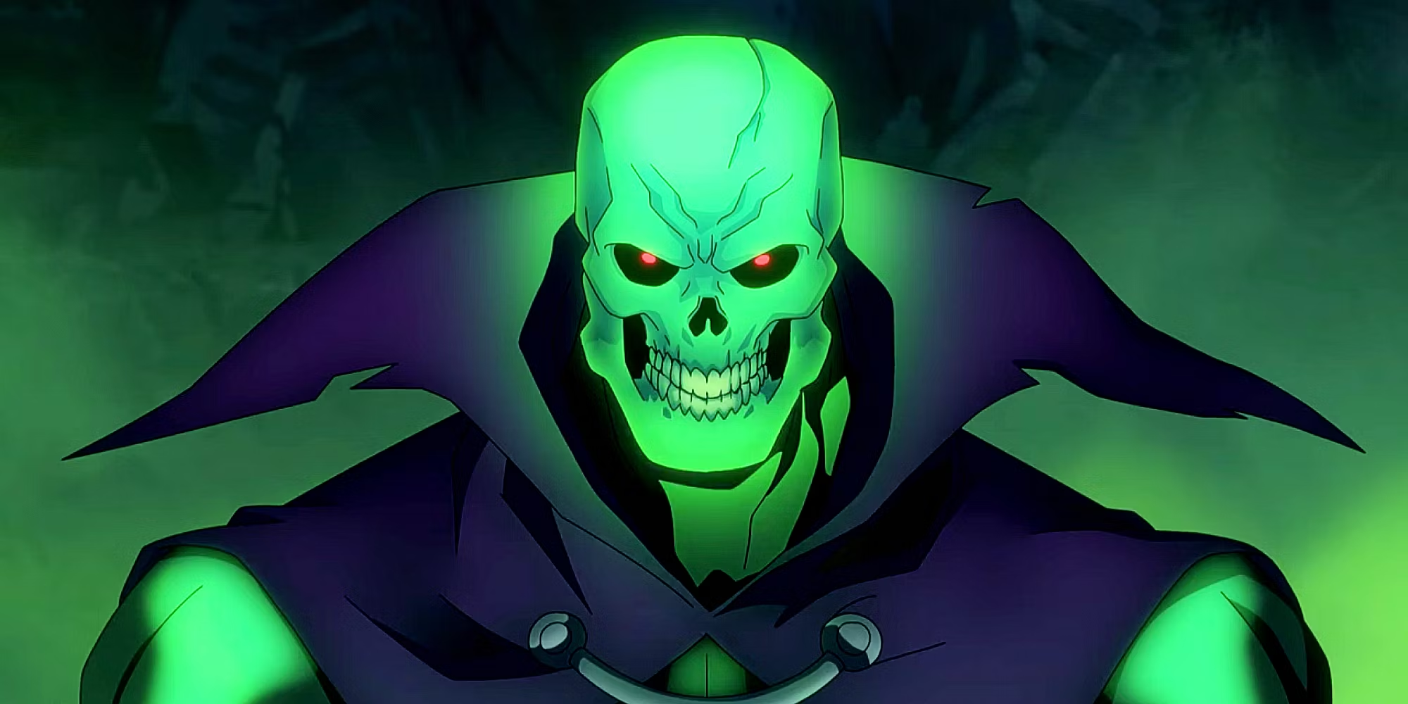 Scare Glow was known as Karak Nul, a shifty bounty hunter who was cursed and banished into the dimension of Infinita. He was brought back to Eternia by a magical spell of light cast by Skeletor to locate the most evil warriors in the five dimensions. Provided with a Scythe of Doom, Nul agreed to join forces with Skeletor and became known as Scare Glow, thanks to his ability to freeze his enemies with fright. Scare Glow initiated a monstrous scheme while He-Man and Skeletor were on the distant planet of Primus. Convening a cabal of supernatural beings, the ghostly Scare Glow collected seven evil artifacts to raise an army of the undead and plunge Eternia into eternal darkness. However, he was thwarted by the heroic Strobo and the royal archaeologist Melaktha.
