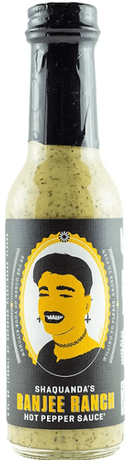 Next is Banjee Ranch from Shaquanda’s, which has a heat rating of 6,200. This ranch-inspired hot sauce has a dreamy texture from tahini, and an herb-y mix of chives, dill, and celery seed that channels nostalgic ranch dressing flavor. Heirloom Sivathei peppers add a subtle heat and earthiness to the sauce. Its ingredients include white distilled vinegar, onion, sugar, chives, and heirloom smoked Sivathei chili.