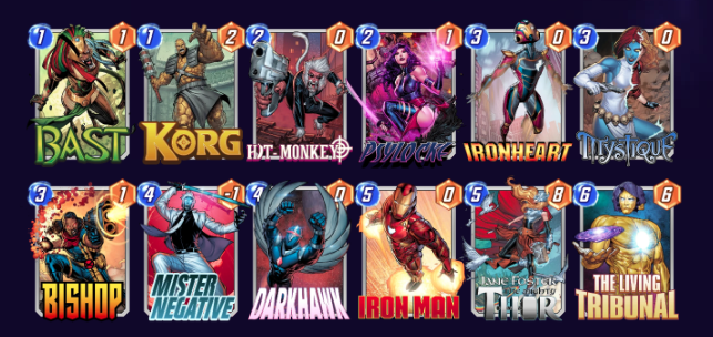 In this deck, the star is Mister Negative, whose ability to switch card costs and Powers can set up massive plays in combination with the Living Tribunal. The success of this deck largely relies on playing Mister Negative early in the game. If you can’t draw him in time, amassing a significant amount of Power might prove challenging. Nevertheless, this deck has the potential to work wonders. With the assistance of Mister Negative’s effect, you can execute powerful plays involving zero-cost cards like Angela, Hit Monkey, Iron Heart, Darkhawk, and Iron Man. Additionally, the inclusion of Bast ensures that all cards in your hand have a minimum Power of three, even if you fail to draw Mister Negative in time.